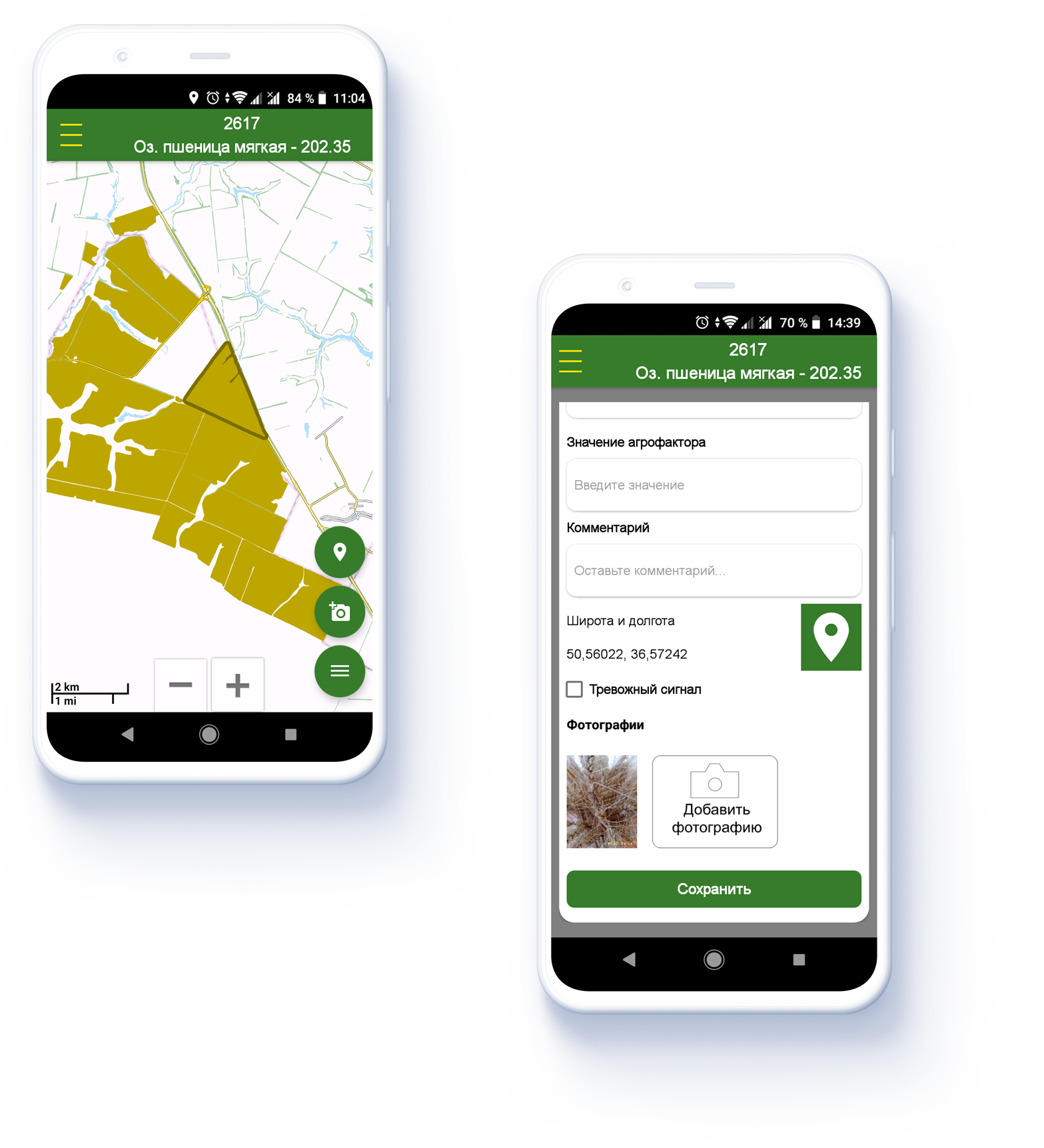 You can conduct field surveys, add photos and notes, view the notes made by other agronomists. You can also use detailed information about the field, weather forecast and history of agricultural operations.